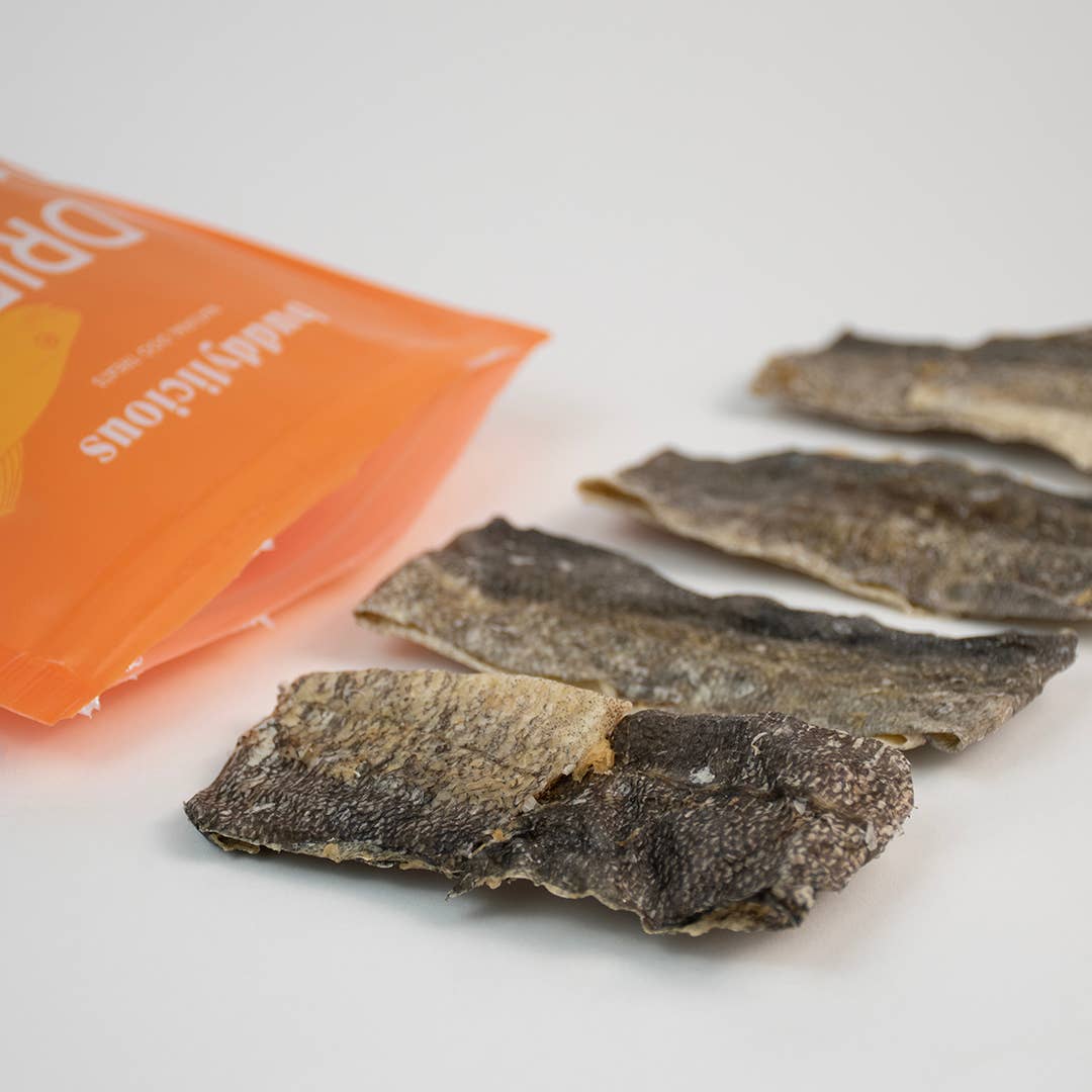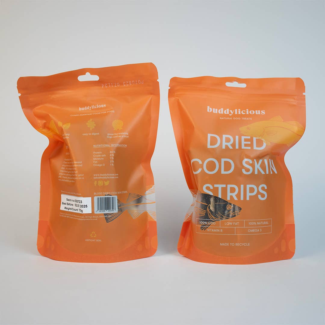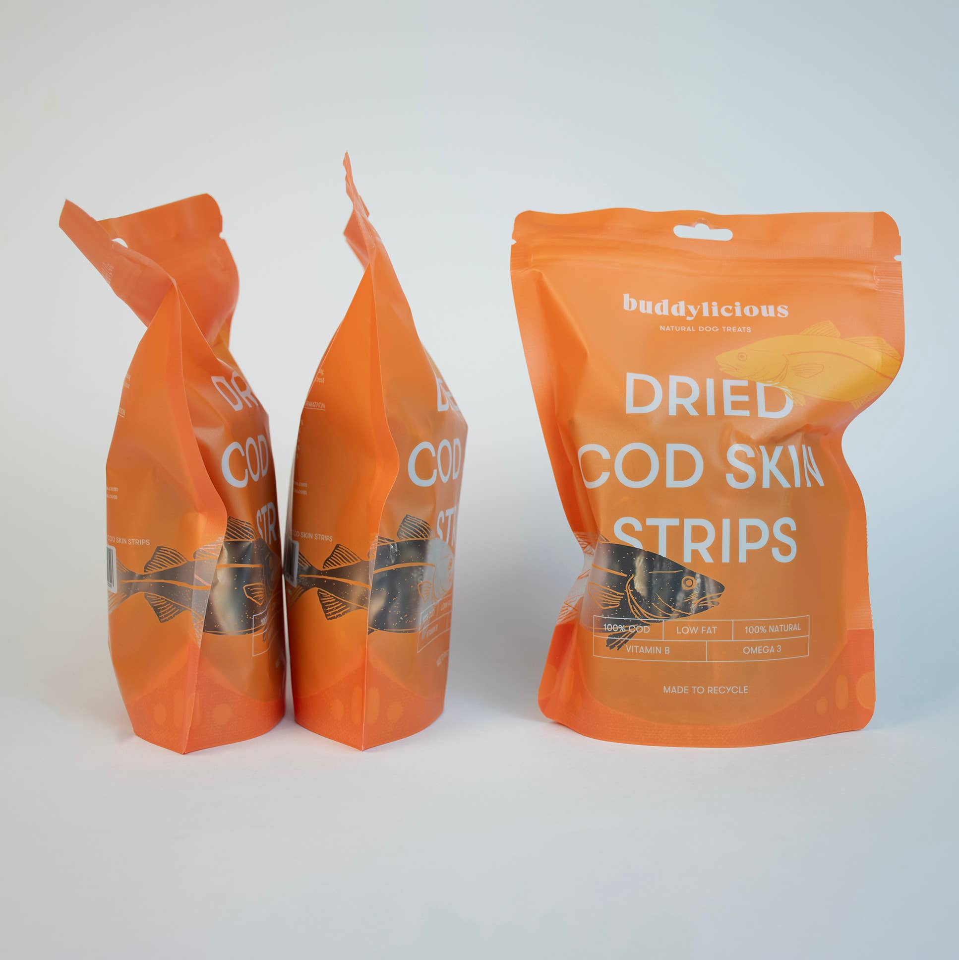 Buddylicious Tørrede Torskeskindstrimler er en ren, enkelt-ingrediens snack af høj kvalitet – ideel som træningsbelønning eller som en ekstra lækker hverdagsgodbid. En skyldfri og nærende snack, du kan give med god samvittighed.