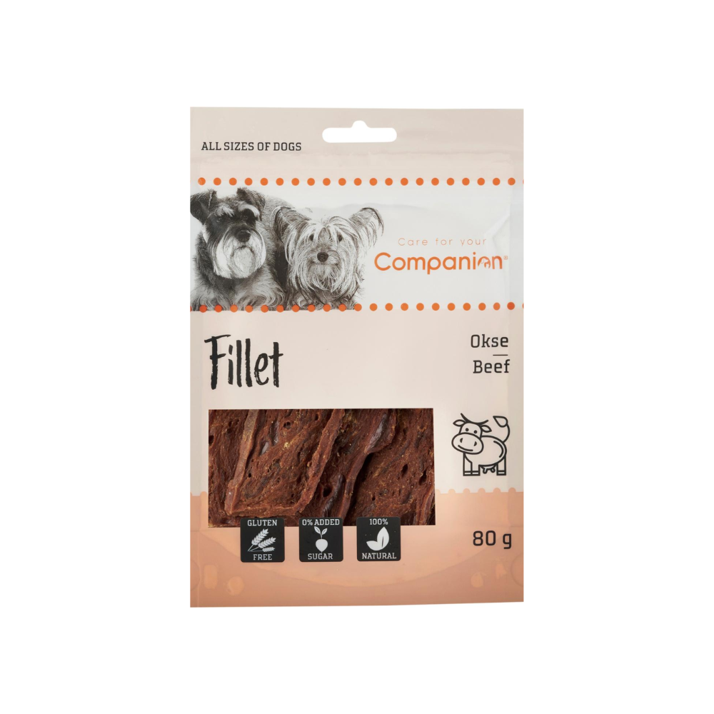 Companion Fillet med okse er en naturlig og smagfuld snack, perfekt som belønning i hverdagen eller som ekstra forkælelse under træningen. Lavet af naturlige ingredienser uden gluten og tilsat sukker – en godbid skabt med omtanke og leveret i en praktisk genlukpose.