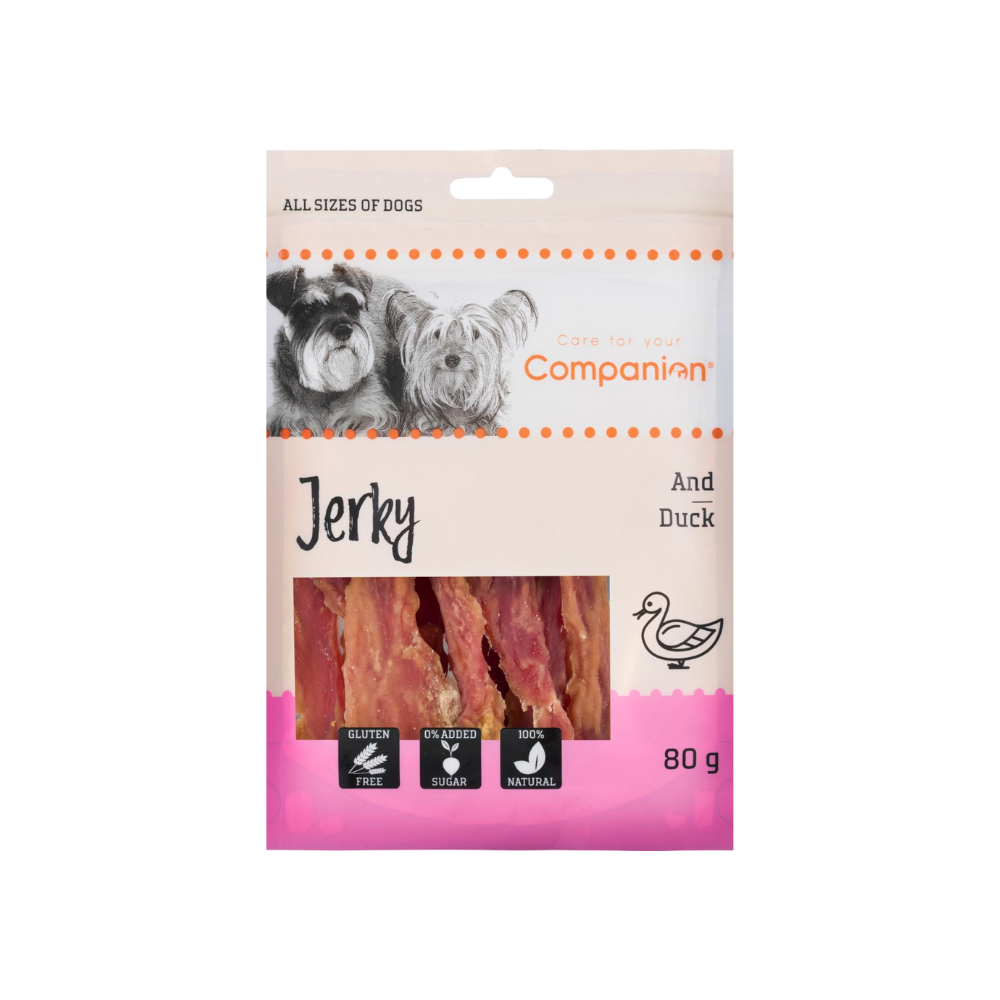 Companion Jerky med and er en smagfuld og naturlig snack – perfekt som daglig belønning eller et ekstra lækkert pift til træningen. Fremstillet af naturlige ingredienser og uden tilsat sukker og gluten. Pakket i en genlukkelig pose, så snacken holder sig frisk og er nem at tage med.
