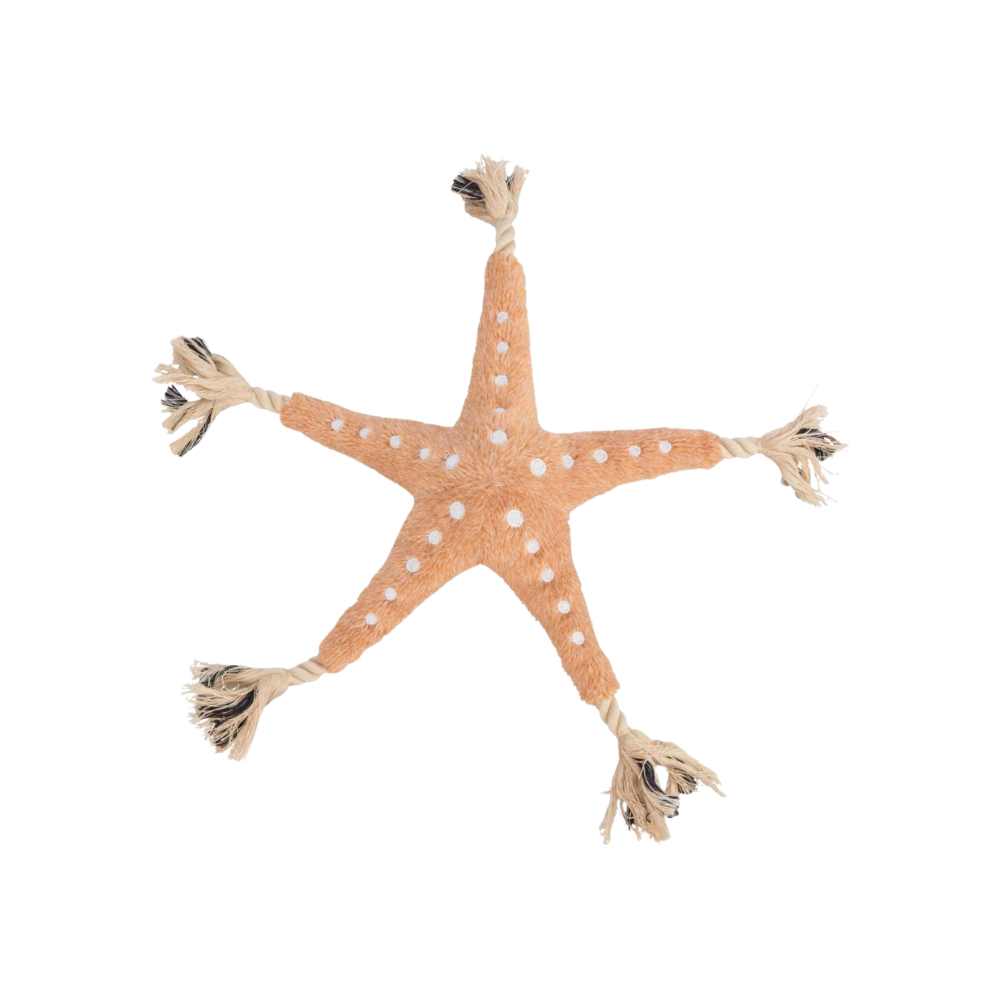 Søstjerne med reb, i blød plys. Dette sjove legetøj kombinerer et attraktivt stjerneformet design med et holdbart reb, ideelt til interaktiv leg med din hund.
