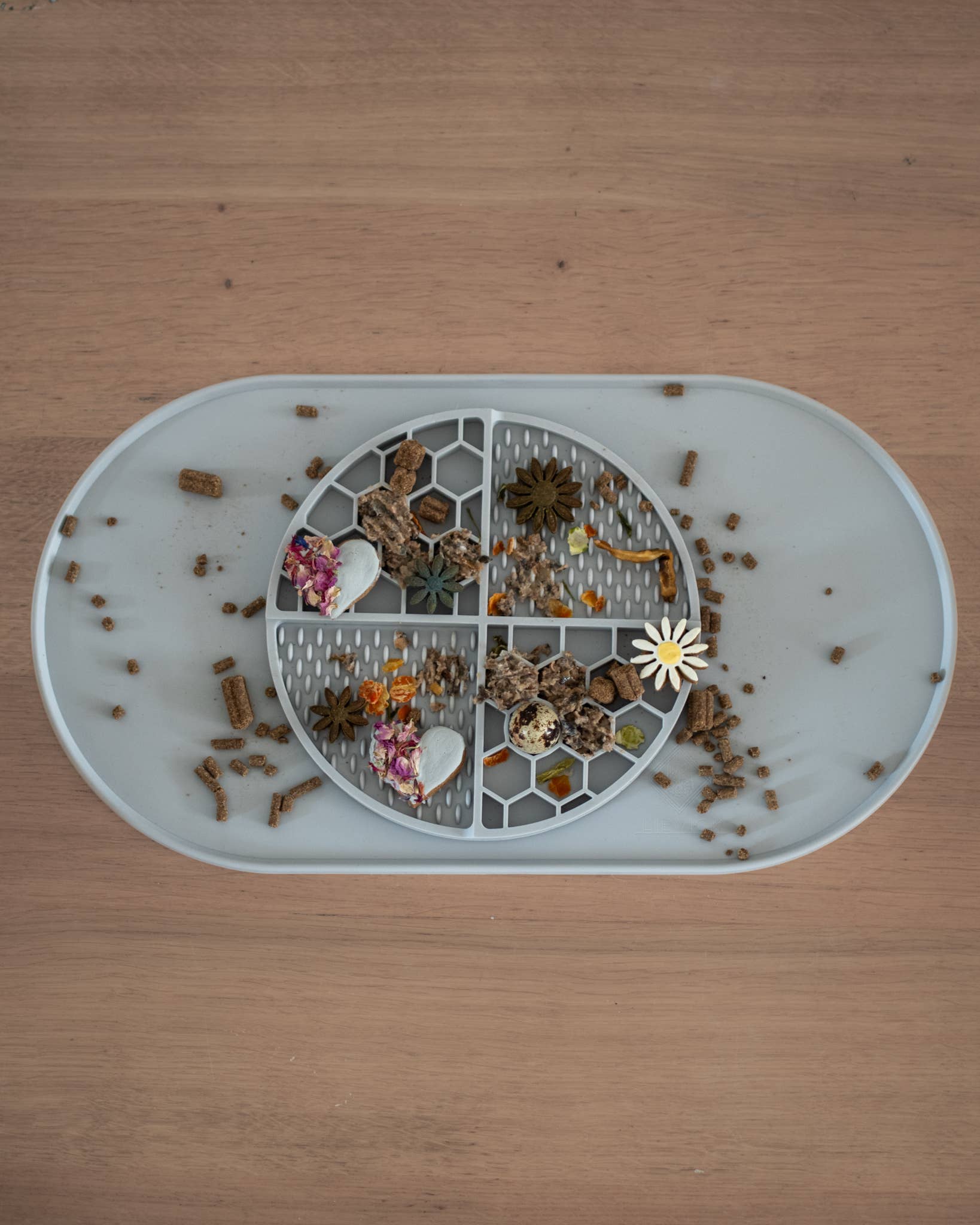 Den eksklusive No Spill dækkeserviet er skabt til at løfte din hunds spiseområde med et minimalistisk design, der blender perfekt ind i din indretning. Skabt med fokus på både praktisk anvendelse og elegance, giver måtten et solidt underlag til både madskåle og slowfeeders, mens den sikrer, at slikkemåtter med sugekopper holder sig på plads uden at beskadige overflader.