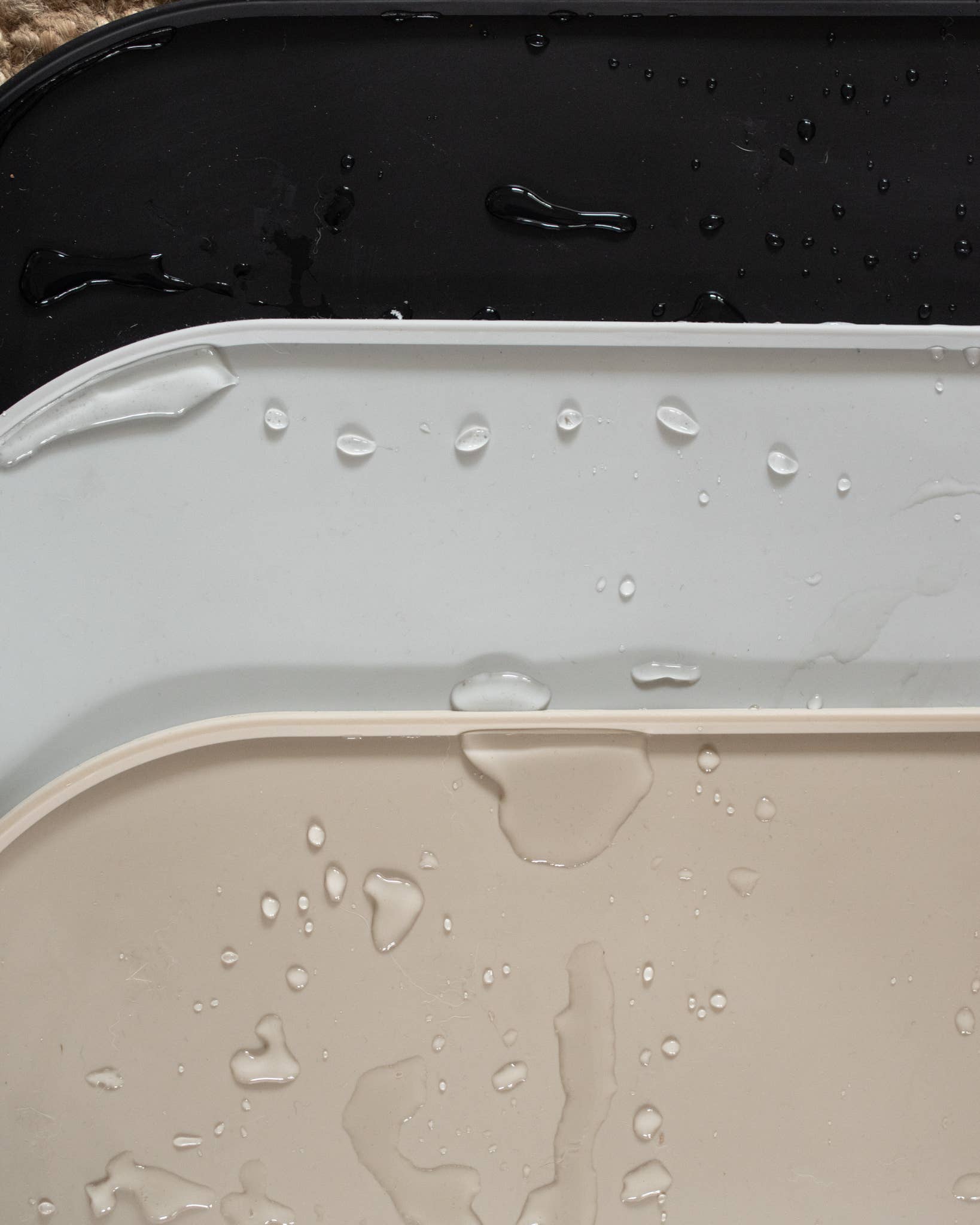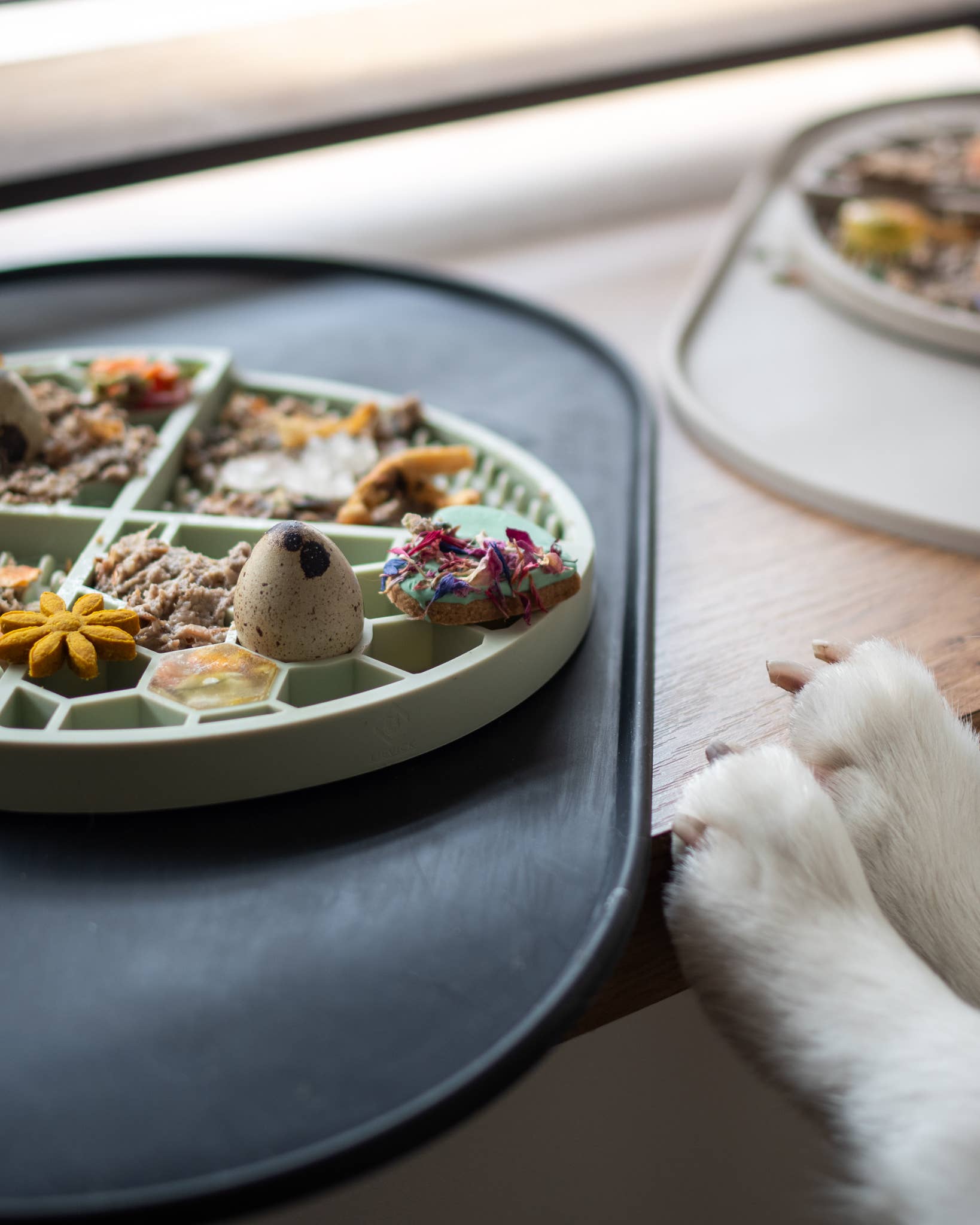 Den eksklusive No Spill dækkeserviet er skabt til at løfte din hunds spiseområde med et minimalistisk design, der blender perfekt ind i din indretning. Skabt med fokus på både praktisk anvendelse og elegance, giver måtten et solidt underlag til både madskåle og slowfeeders, mens den sikrer, at slikkemåtter med sugekopper holder sig på plads uden at beskadige overflader.