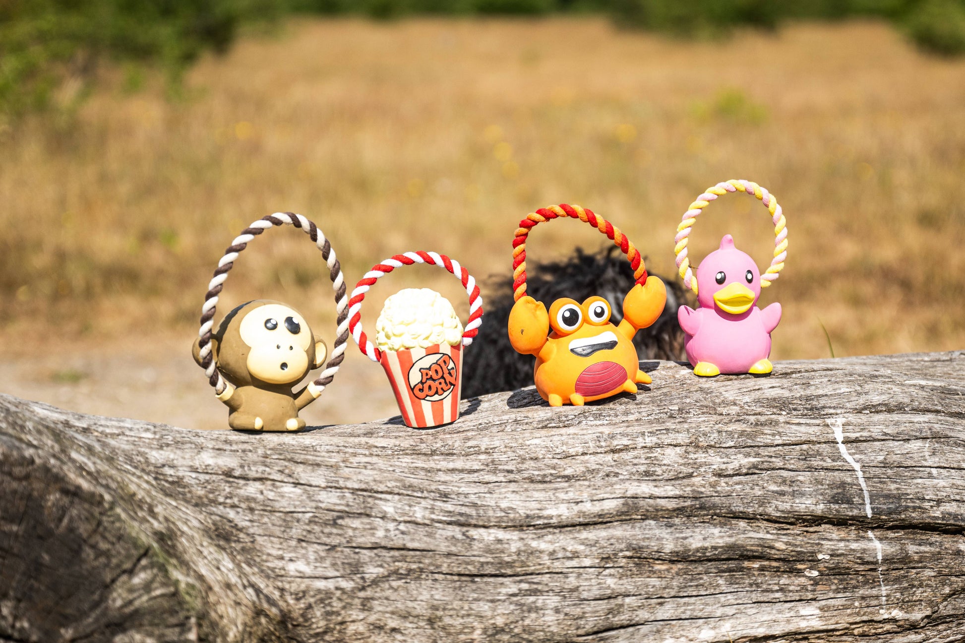 Mød Daisy, Lenny, Julian og Pop – fire farverige figurer, der alle leder efter en ny, lodden ven at lege med. Tuggles-legetøjet kombinerer flere af hundens favoritter i ét og samme produkt: rebhåndtag, knirkelyd og et sjovt, håndmalet design*.