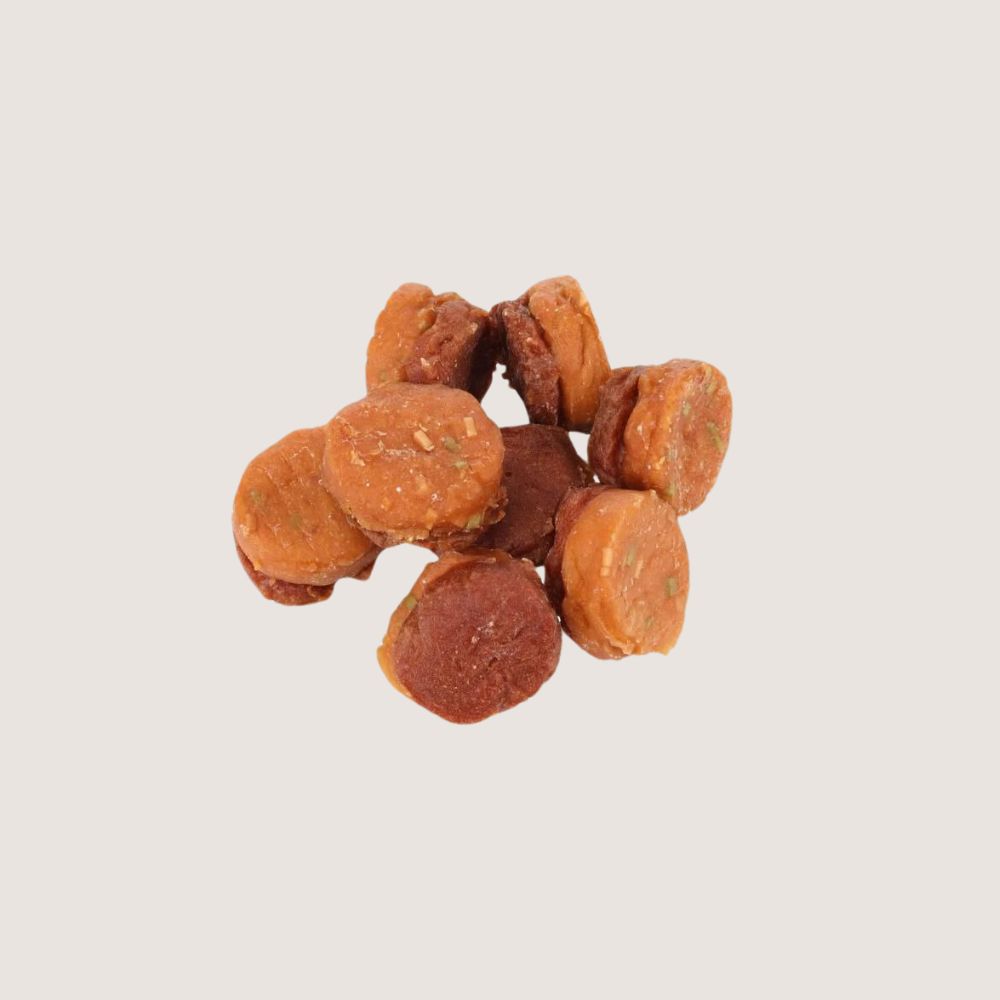 And 60%, kylling 23% glycerin, stivelse, vegetabilsk protein, hvedemel, trehalose, ærter kostfiber, sorbitol, vegetabilsk olie, kålpulver, gulerodspulver, karamel.