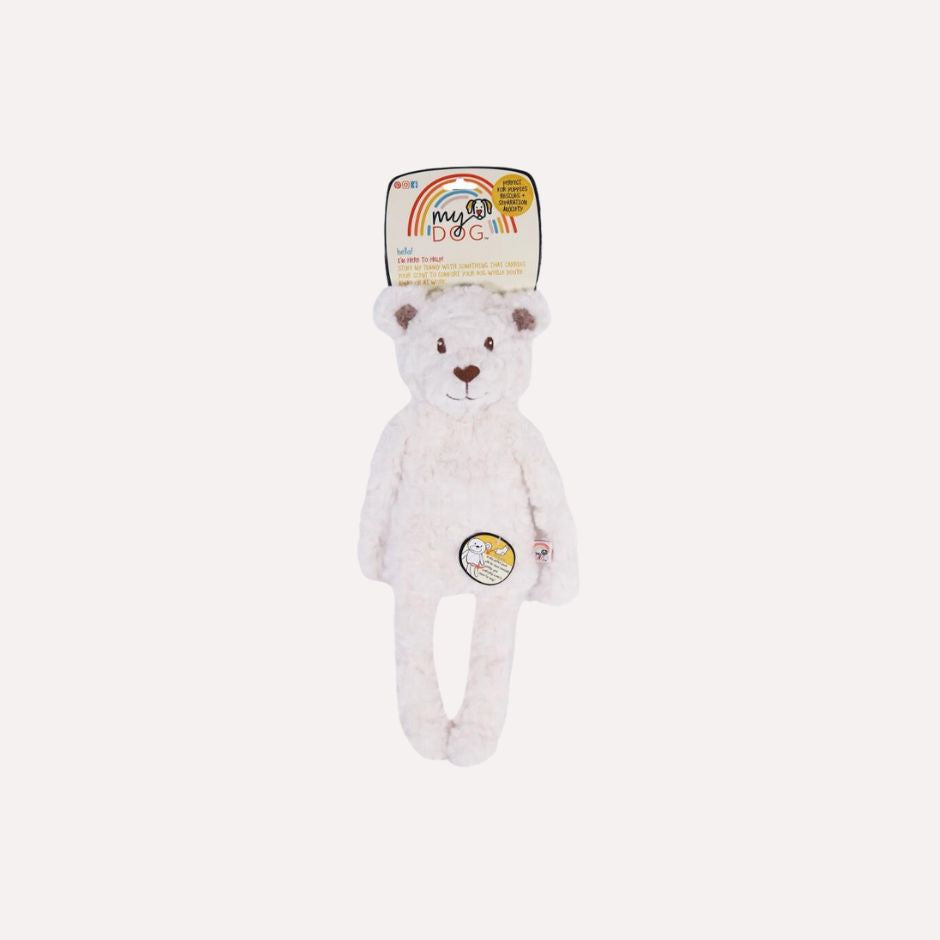 My Dog plyslegetøj af mærket Rosewood. Sød bjørn i lækkert blødt plys med squeaker og knitrelyd. Ideel til den lille hvalp, der skal flytte til sit nye hjem eller hunde, der skal lære at være alene hjemme. Maven kan fyldes med noget, der dufter velkendt f.eks. en sok, og som trøster hunden og giver den tryghed.