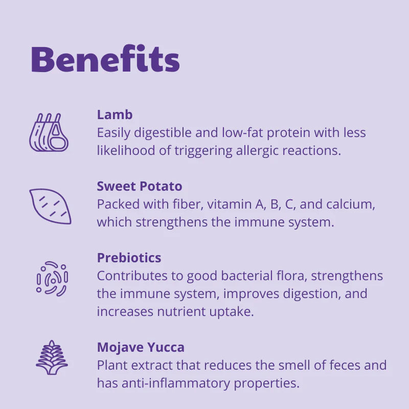 Let at fordøje – Indeholder 60 % kød med lam, som er et letfordøjeligt protein, skånsomt for maven.