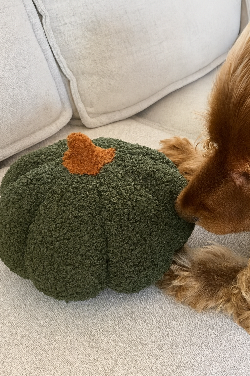 Giv din hund hyggelige øjeblikke fyldt med leg og nærvær med dette bløde græskar-legetøj, håndlavet af overskudstekstiler fra tekstilindustrien. Legetøjet fås i to skønne efterårsfarver: skovgrøn med brun stilk og rustorange med salviegrøn stilk.
