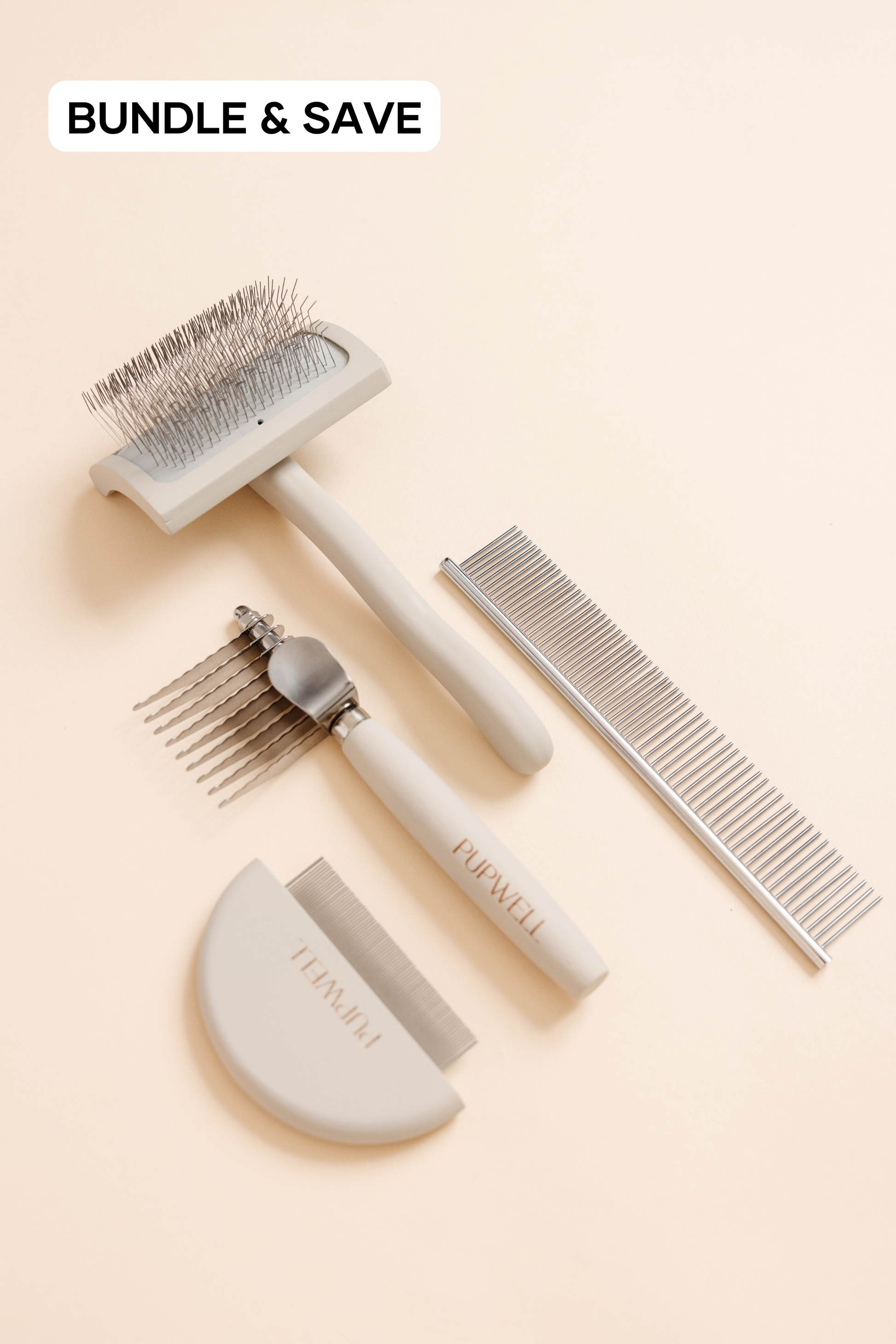 Sættet inkluderer fire essentielle værktøjer: Everyday Slicker Brush, Detangling Comb, Detailer Comb og Everyday Comb, som alle er nøje udvalgt af vores team af hvalpeforældre og grundlæggere.