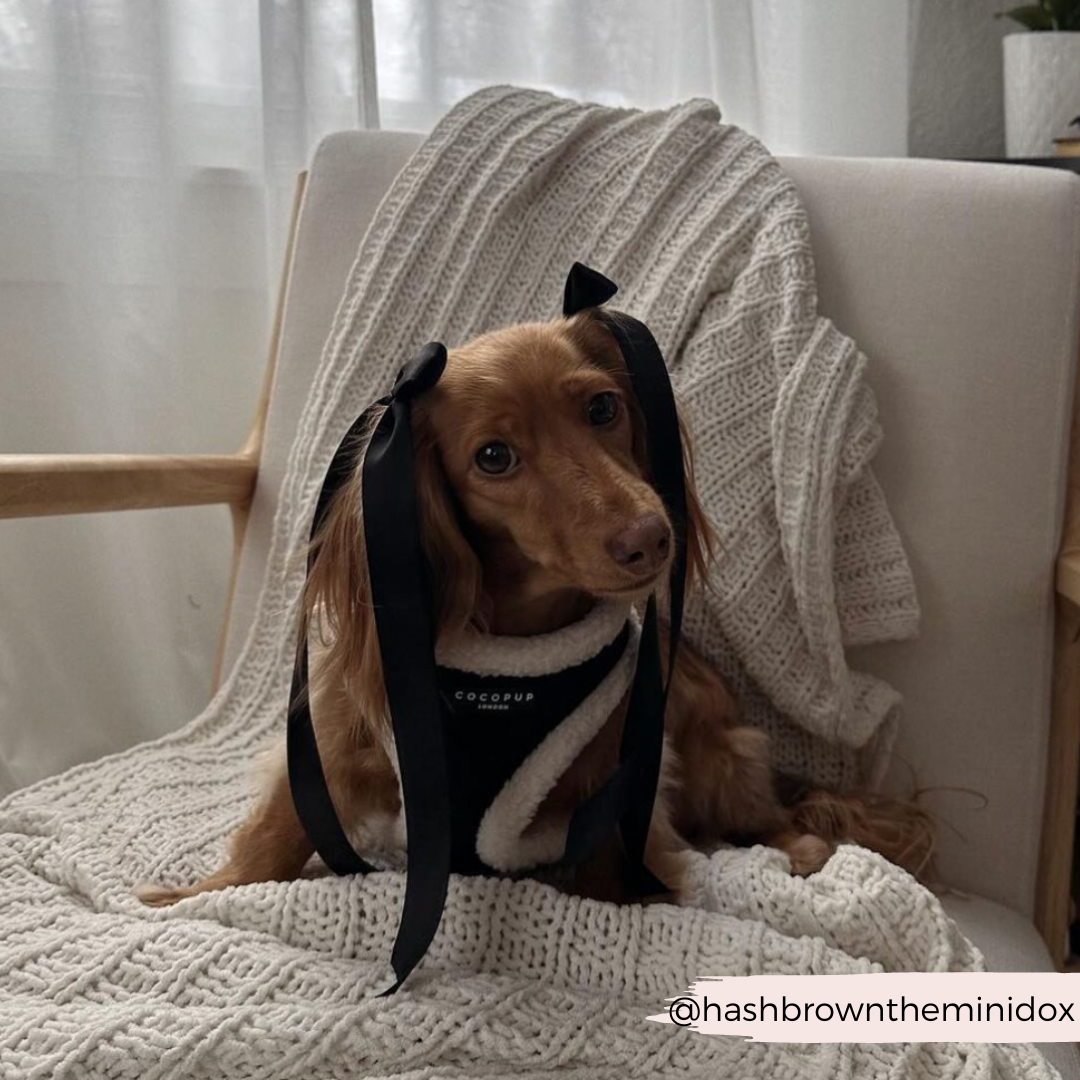 Placer over din hvalps hoved, juster ved nakke og bryst, fastgør i siden, så er du klar til gåturen!