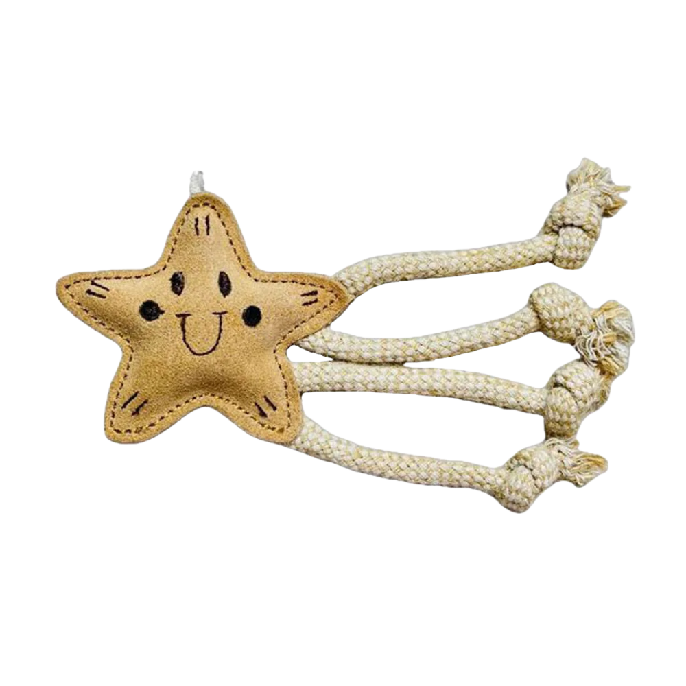 Denne bløde plysbamse i ruskind fyldt med kokosfiber med bomulds- og jutereb er helt naturlig og sikker for hunden.