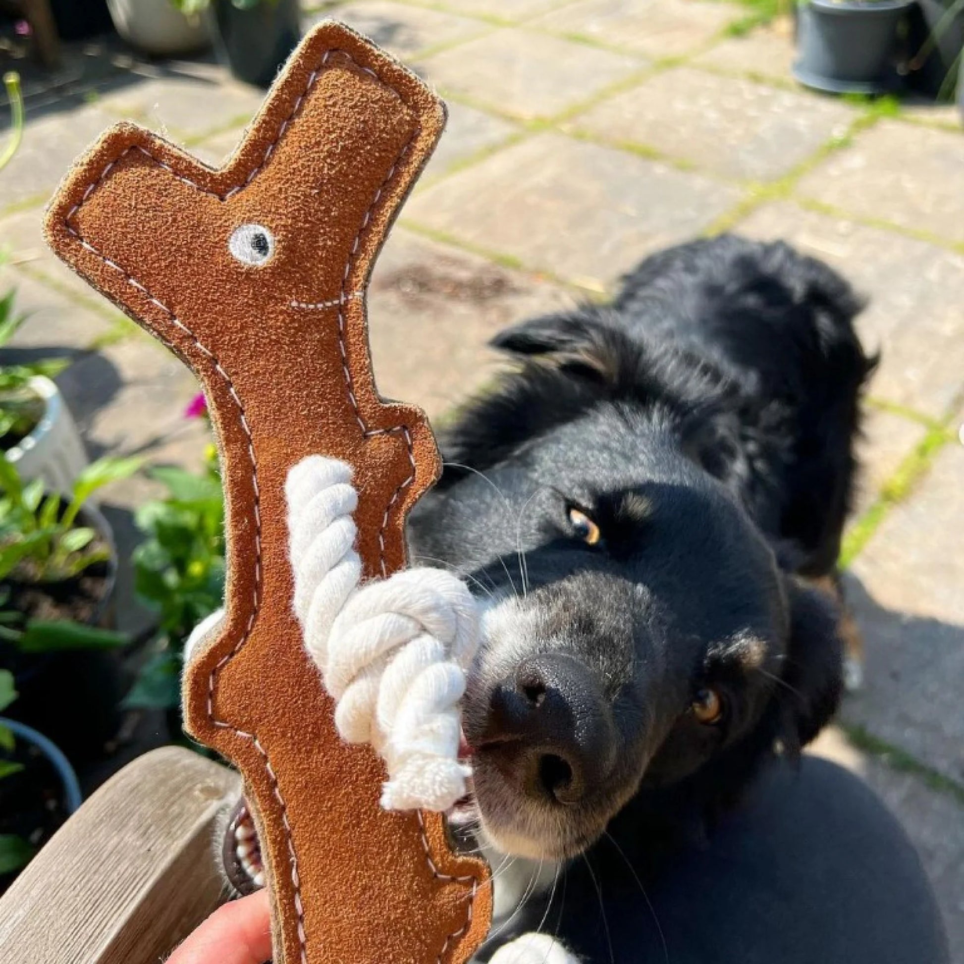 Jute er en naturlig og bæredygtig plantefiber, og ruskindet er et biprodukt, så materialet ikke går til spilde. Legetøjet er stærkt, holdbart og fremstillet helt uden skadelige tilsætningsstoffer, der kan frigives, når hunden tygger. Både uldfilt og jute er 100 % bionedbrydelige.