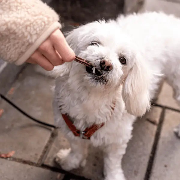 🦴 Tyggepindene indeholder kollagen af højeste kvalitet, hvilket blandt andet er godt for hundens knogler, ledbånd, muskler og tænder.