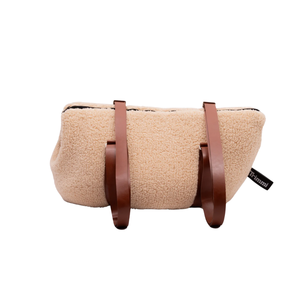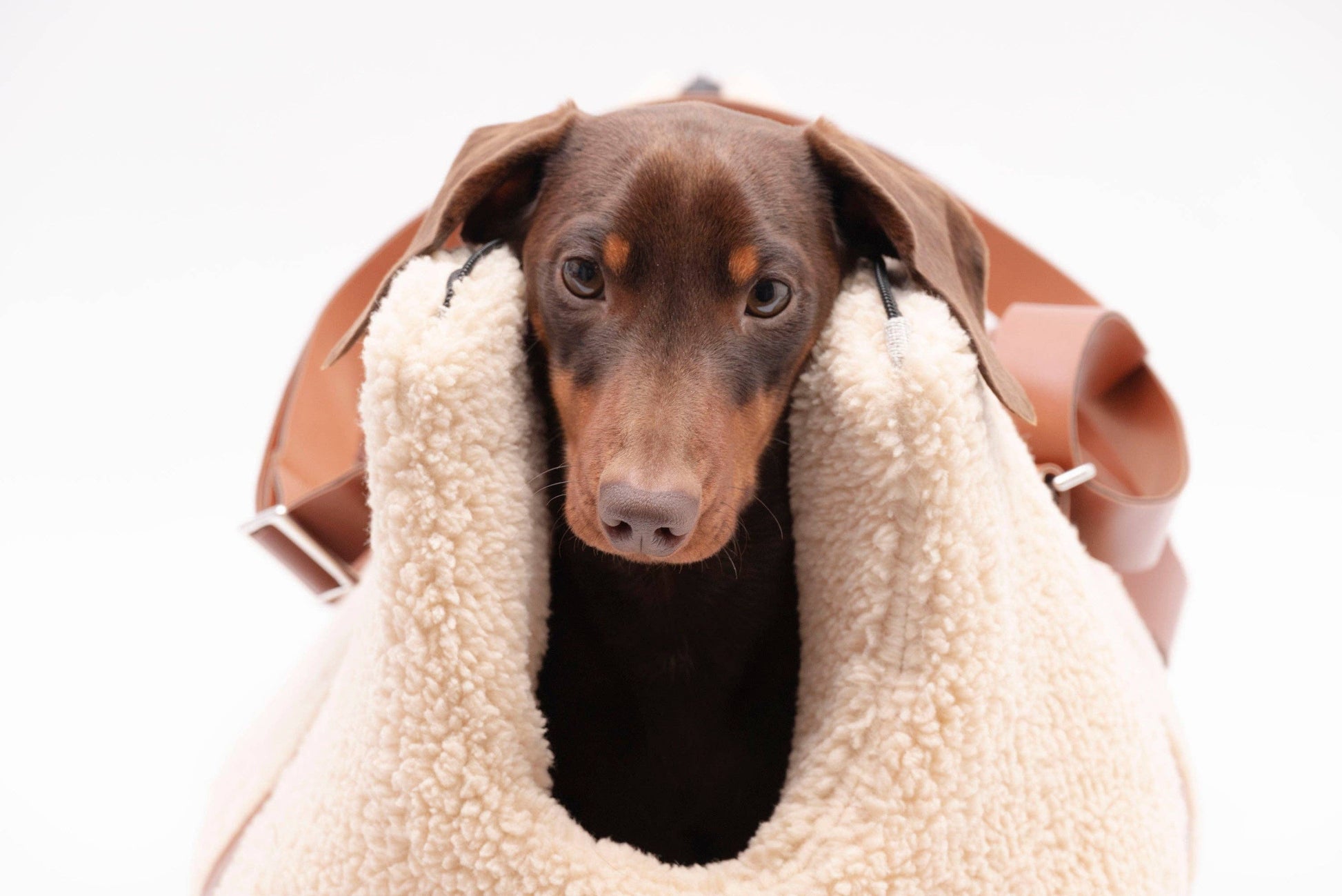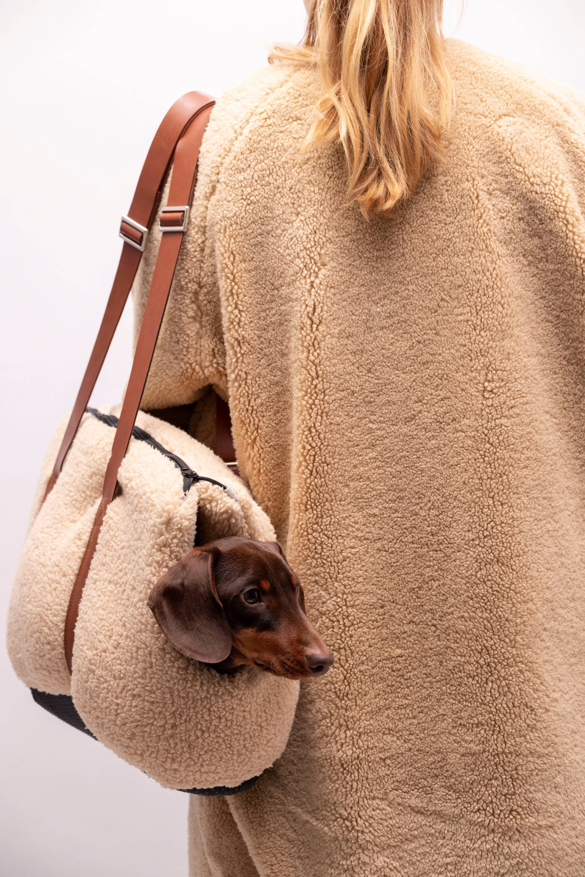 Den perfekte kombination af stil, komfort og funktionalitet – denne hundebæretaske i blødt teddystof giver din hund et trygt og hyggeligt sted at rejse.