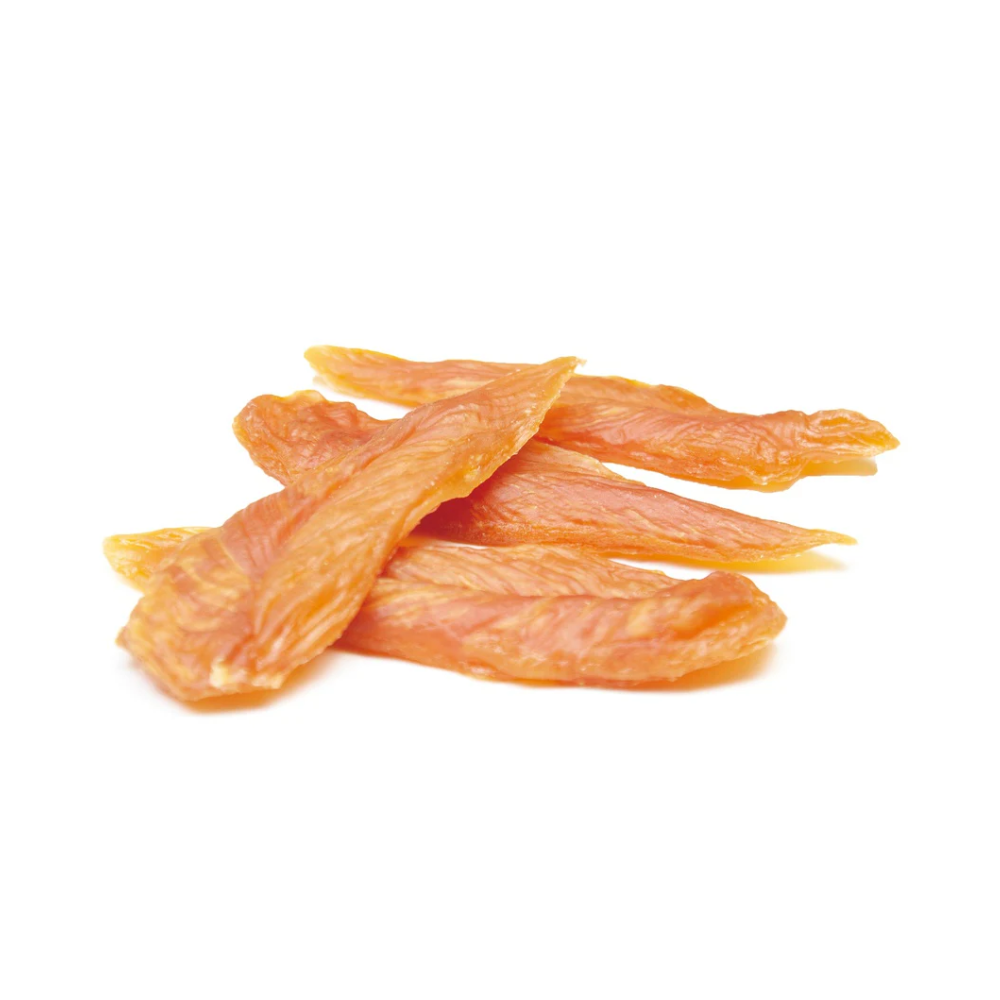 Et stykke nænsom tørret kyllingefilet, en sprød snack til din hund, den har en tandrensende effekt da der er en del tyggetid.