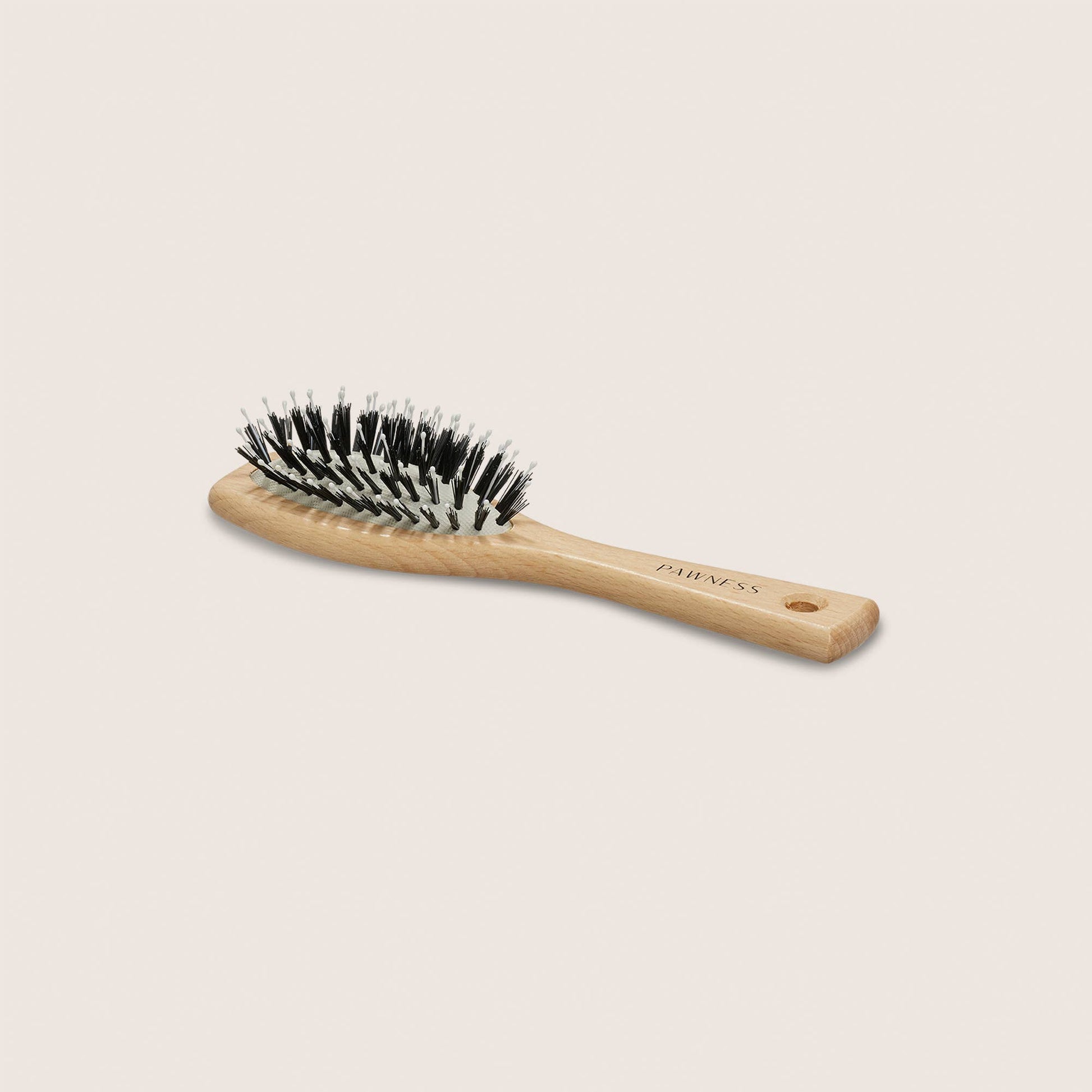Denne højkvalitets børste kombinerer lange nylonstifter til at udrede pelsen og korte børster, der giver en flot glans. Lavet af FSC-certificeret bøgetræ, er den både miljøvenlig og 100% vegansk. Din hund vil elske den blide fornemmelse, og grooming vil føles som en luksuriøs spaoplevelse hver gang.
