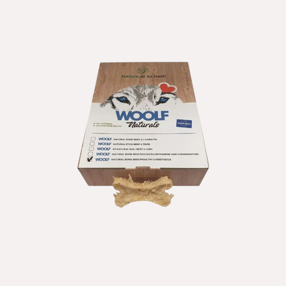 Woolf Natural Bone Beef & L-Canitin er en naturlig glutenfri snack med oksehud. Der er ikke tilsat farvestoffer eller konserveringsmidler.